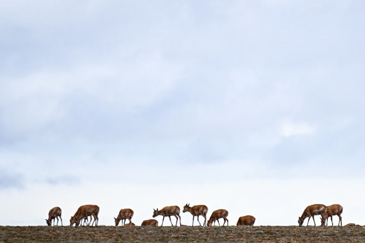 ??藏羚羊在青??煽晌骼镂宓懒旱貐^(qū)遷徙(2024年5月27日攝)。新華社記者 張龍 攝
