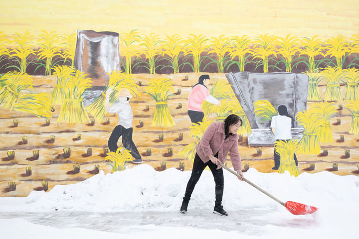??黑龍江省漠河市北極鎮(zhèn)北紅村“遠方故里”民宿負責人張翠花在清理積雪(2023年1月12日攝)。新華社記者 張濤 攝