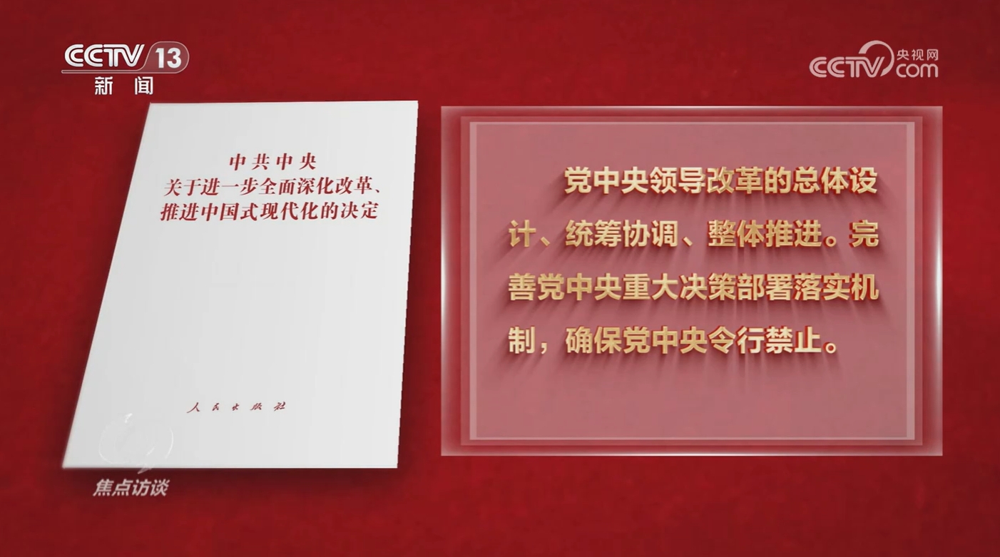 新征程上,如何提高黨對進一步全面深化改革、推進中國式現(xiàn)代化的領導水平?《決定》專門用一個部分來進行部署,并從三個方面作出具體安排,第一方面的重點是,堅持黨中央對進一步全面深化改革的集中統(tǒng)一領導。