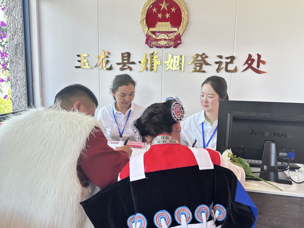 玉龍縣公園式婚姻登記處工作人員為新人辦理婚姻登記。(供圖)