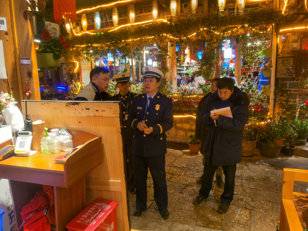12月5日,支隊(duì)夜查組在古城開(kāi)展防火巡查時(shí)提醒商戶(hù)注意冬季用火用電。(供圖)