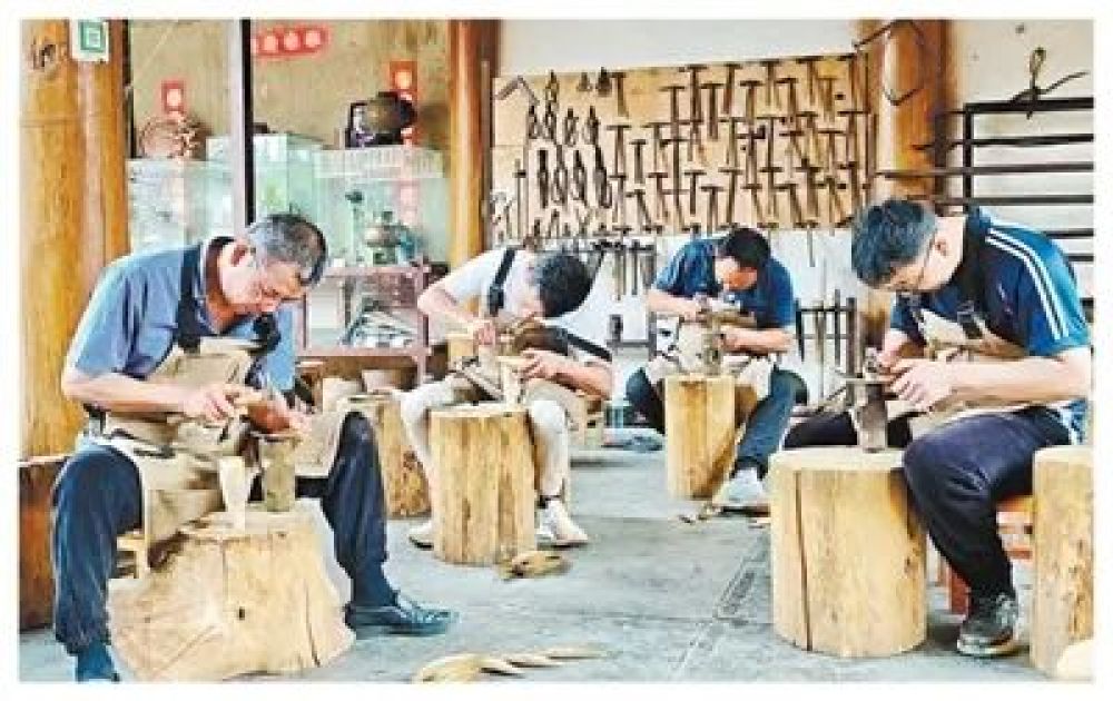 和善均(左一)與徒弟在打制銅器。和善均 供圖
