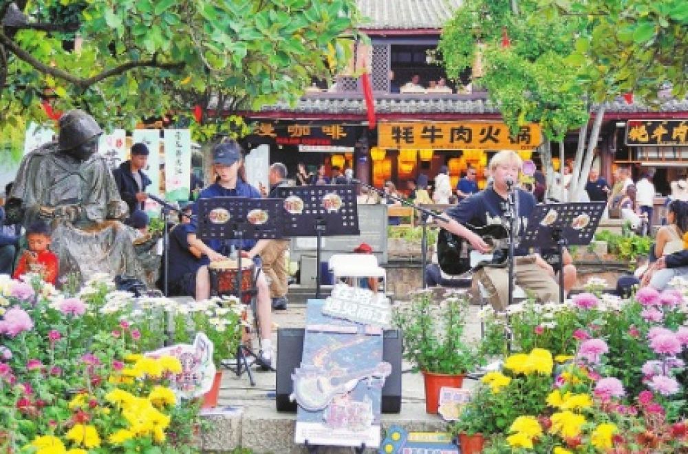 連日來(lái),麗江民謠音樂(lè)季路演活動(dòng)在麗江古城地標(biāo)四方街接連上演,為游客獻(xiàn)上一場(chǎng)場(chǎng)聽(tīng)覺(jué)盛宴,讓節(jié)日的古城更添文藝氣息與浪漫情懷。10月2日、4日、6日,本地優(yōu)秀民謠樂(lè)隊(duì)和歌手齊聚于此,懷抱吉他,淺吟低唱,將一首首承載著麗江故事的歌曲娓娓道來(lái)。動(dòng)人的旋律伴著秋日和煦的陽(yáng)光,在古老的街巷間緩緩流淌,吸引了無(wú)數(shù)游客駐足聆聽(tīng)。