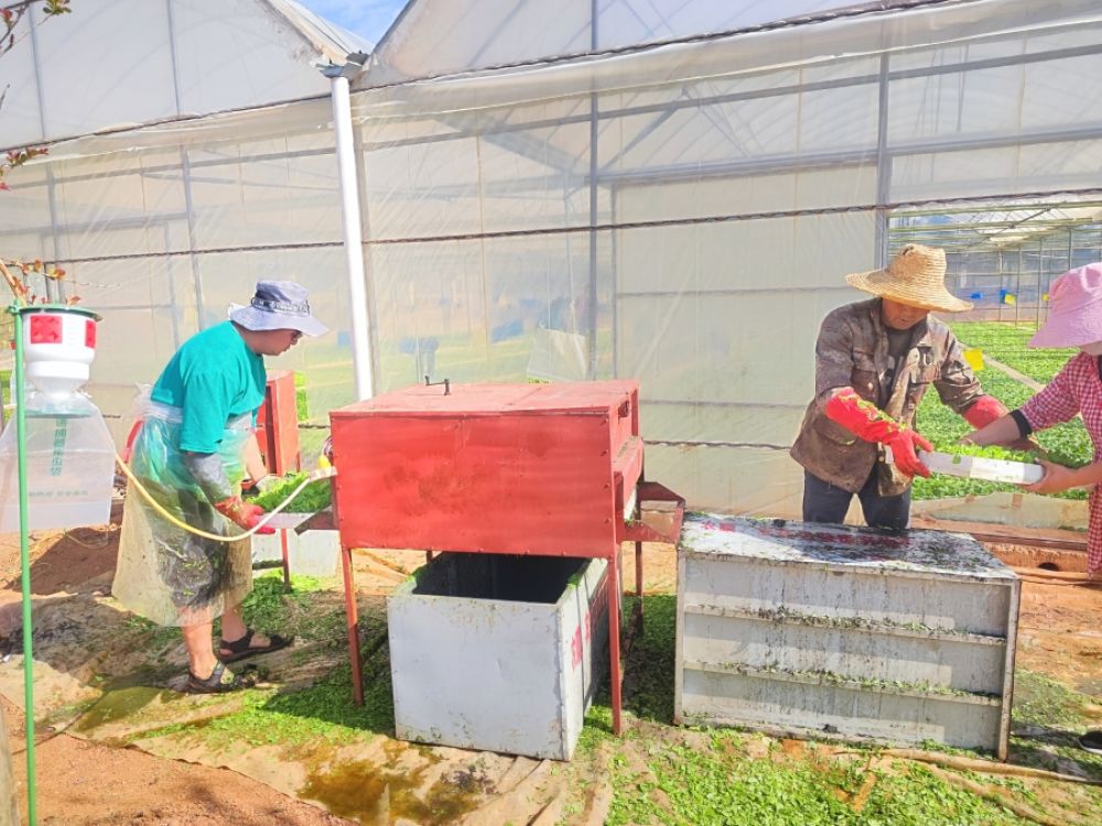 在保證煙苗生長環(huán)境的同時,“倒春寒”還引進(jìn)了掐葉露稈機(jī)降低育苗成本,提升壯苗率?!叭ツ?0個工人1天才能完成1個大棚去除煙苗子葉的工作,現(xiàn)在有了掐葉露稈機(jī),6個工人1天就能完成4個大棚去除煙苗子葉的工作,節(jié)約了人工成本,育苗管理更及時,煙苗遭受病毒侵染的幾率也降低了?!惫懦菂^(qū)三義育苗隊隊長和永紅說。