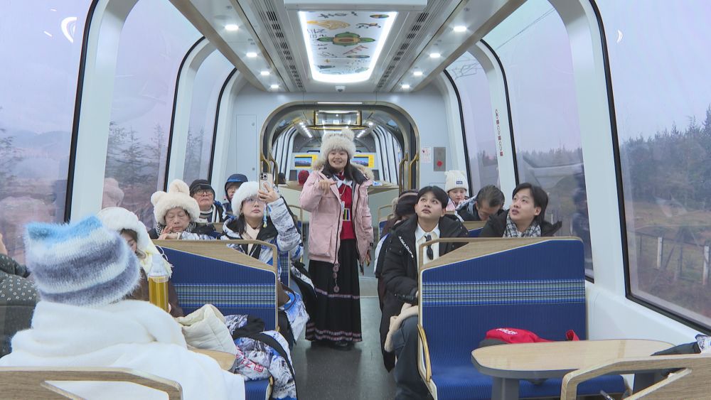 柬埔寨網(wǎng)紅團(tuán)乘坐雪山觀光火車前往玉龍雪山景區(qū)。(麗江融媒記者 和繼鵬 攝)