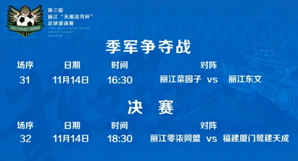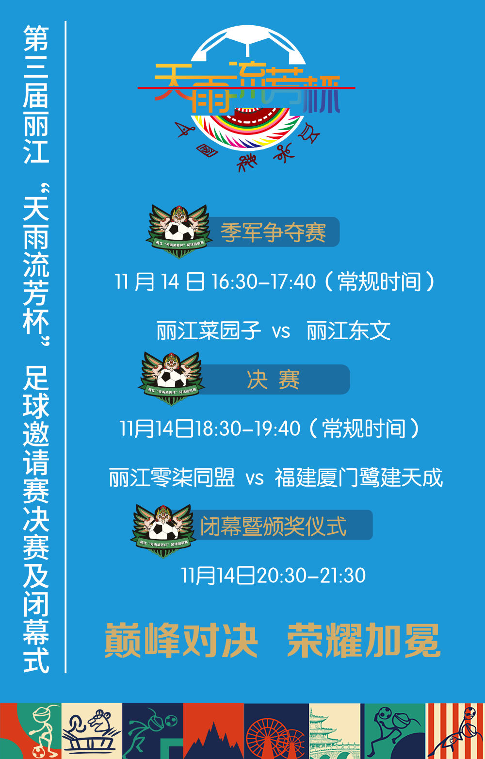 11月14日18:30,第三屆麗江“天雨流芳杯”足球邀請賽決賽夜,麗江零柒同盟將對陣福建廈門鷺建天成,爭奪最終冠軍桂冠。此外,16:30進行季軍爭奪戰(zhàn),麗江菜園子將對陣麗江東文。全部賽程結(jié)束后,將舉行盛大的閉幕儀式,為獲獎球隊和個人頒獎,并由和文軍領銜帶來文藝展演。