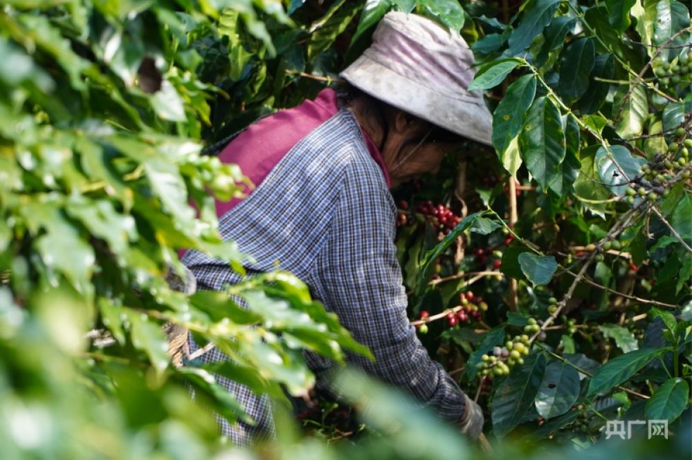 普洱咖啡成熟季,咖農(nóng)們在采摘咖啡鮮果(央廣網(wǎng)記者 魏文青 攝)