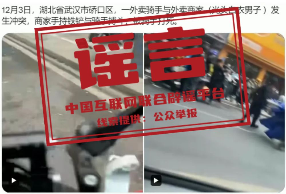 ??真相:近日,一段聲稱“外賣騎手與商家沖突致人死亡”的視頻在多個社交平臺傳播,引發(fā)關(guān)注。部分截圖配文稱:“12月3日,湖北省武漢市硚口區(qū),一外賣騎手與外賣商家發(fā)生沖突,商家手持鐵鏟與騎手搏斗,被騎手打死?!睋?jù)宜昌市陸城街道辦事處工作人員回應(yīng),該視頻信息嚴重失實,實為外賣騎手見義勇為,制止街頭掃碼騙局事件,現(xiàn)場無人傷亡,兩名騎手事后還獲得了社區(qū)表彰。(來源:“大河報”微信公眾號、“今日陸城”微信公眾號)