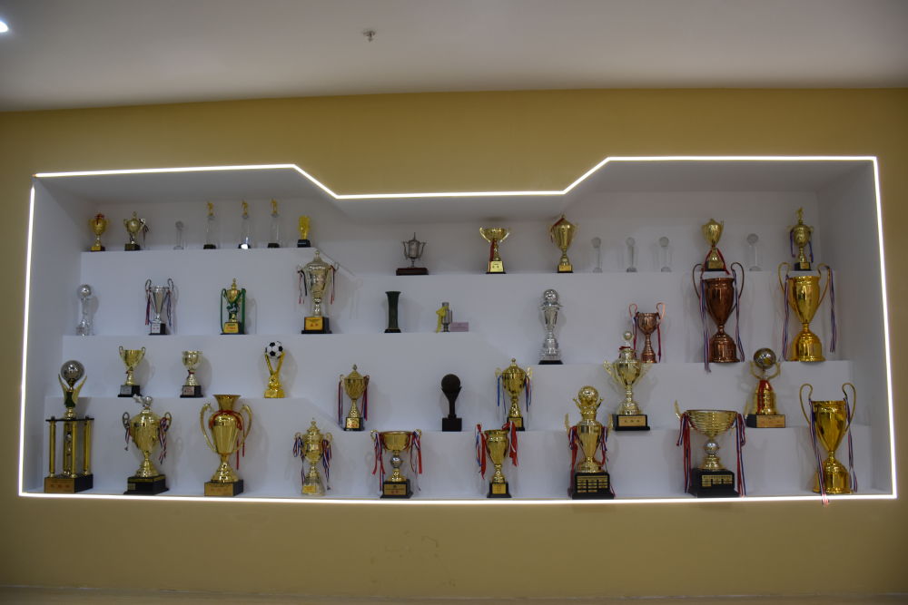 歷屆麗江足球隊(duì)獲得的獎(jiǎng)杯。麗江融媒記者 楊四娟 攝