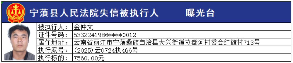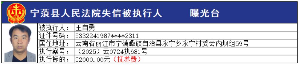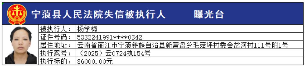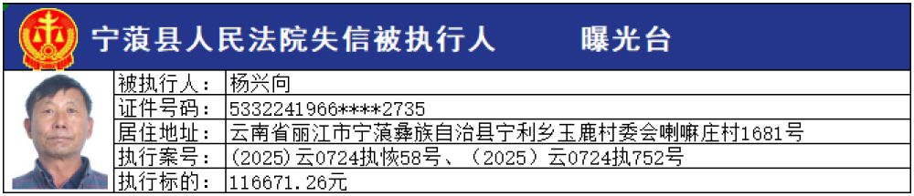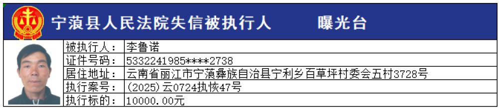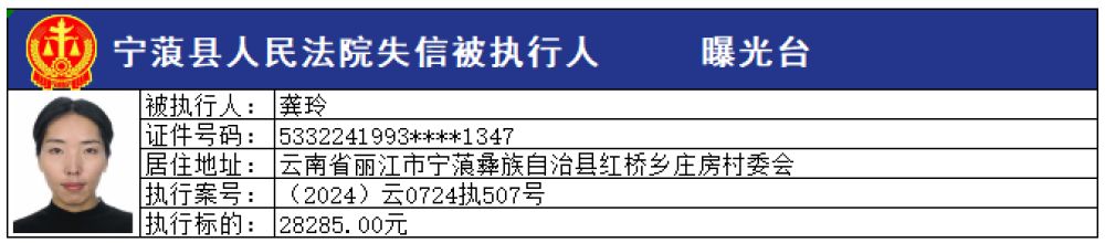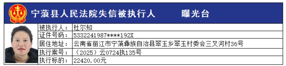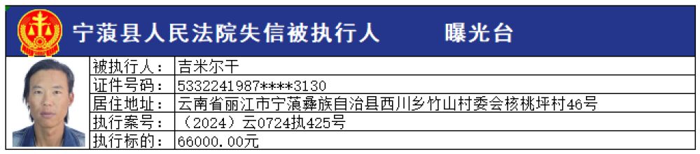 為切實維護申請執(zhí)行人的合法權(quán)益,推進社會信用體系建設(shè),維護司法權(quán)威,敦促被執(zhí)行人自覺履行生效法律文書確定的義務,寧蒗縣人民法院根據(jù)《最高人民法院關(guān)于公布失信被執(zhí)行人名單信息的若干規(guī)定》的規(guī)定,現(xiàn)向社會公布本院最新一批失信被執(zhí)行人員名單,請社會各界予以監(jiān)督。