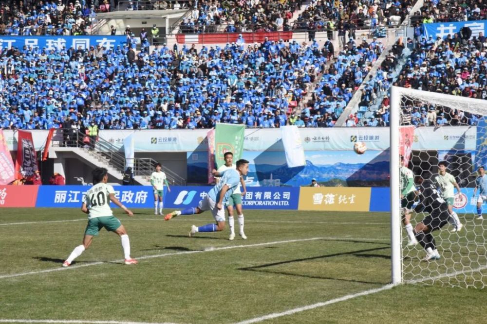 上一場(chǎng)比賽,張澤霖魚(yú)躍沖頂進(jìn)球瞬間。(麗江融媒記者 和玉松 攝)