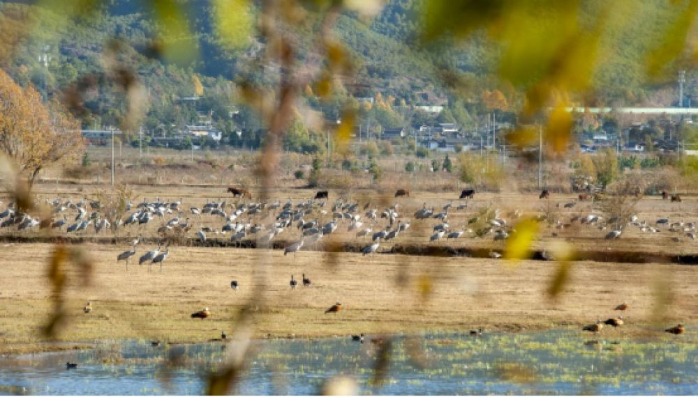 目前,保護(hù)區(qū)內(nèi)記錄到鳥類達(dá)341種,其中國(guó)家重點(diǎn)保護(hù)鳥類69種,以冬候鳥為核心特色。每年冬季黑鸛、灰鶴、斑頭秋沙鴨等珍稀鳥類翩躚而至,共同繪就“萬鳥翔集,湖光山色” 的生態(tài)盛景。在這里,你既能邂逅候鳥凌波起舞的靈動(dòng)身姿,亦能沉浸式感受納西文化與濕地生態(tài)交融的獨(dú)特魅力。