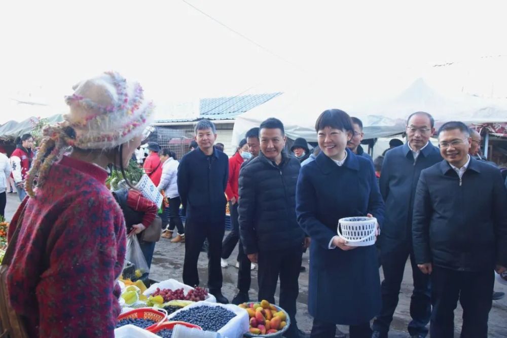 2月14日,浦虹、聶金輝在象山綜合市場察看商品供應銷售情況,與市場負責人和經(jīng)營戶親切交流。(麗江融媒記者 和麗芬 攝)