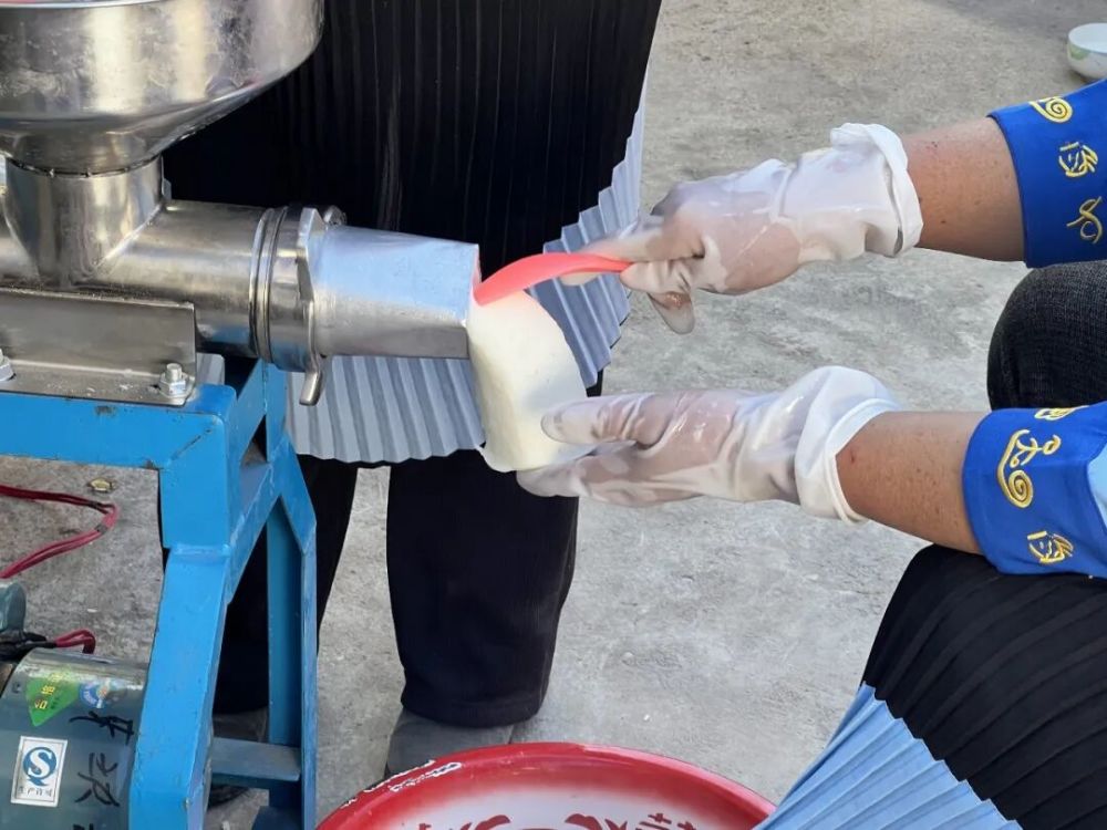 蒸至半熟的米要進行二次淘洗,再入甑復蒸至熟透,趁熱將糯米飯移入專用舂打機,這是餌塊制作的核心工序。如今,傳統(tǒng)的手工舂打雖被更便捷的機器替代,卻依舊少不了繁瑣的協(xié)作流程:兩人默契配合,一人添米并適時翻動,在機器的反復舂打下,米粒漸漸褪去原形,變得細膩筋道、拉絲成團,揉成溫潤的米團。