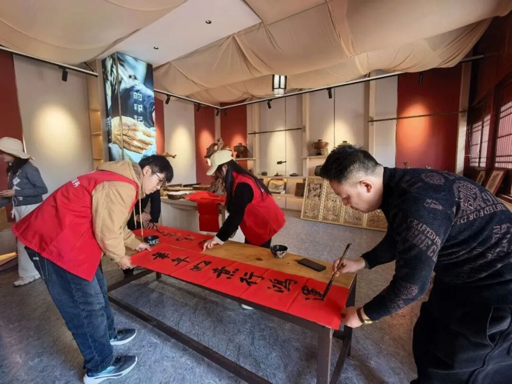 在翰墨送福區(qū)域,者灣村書法家們齊聚一堂、揮毫潑墨,飽蘸濃墨書寫寓意吉祥的春聯(lián)與福字,筆力遒勁、年味十足。村民們有序領(lǐng)取一幅幅紅彤彤的春聯(lián),個(gè)個(gè)喜笑顏開(kāi)。
