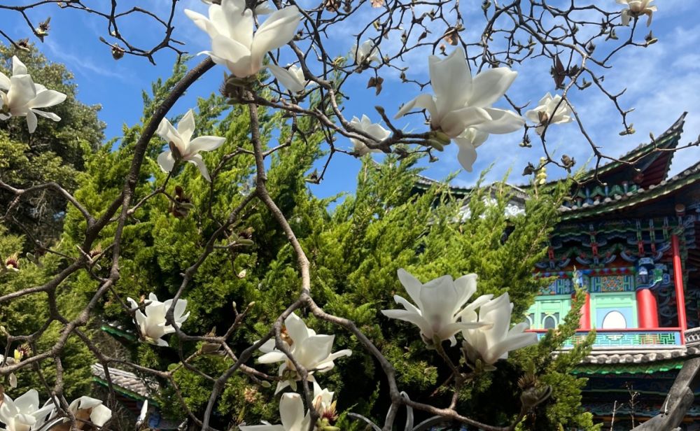 麗江黑龍?zhí)豆珗@五鳳樓里的白玉蘭悄然盛放,潔白花影與古建飛檐相映成趣。(麗江融媒記者 段玉菊 攝)