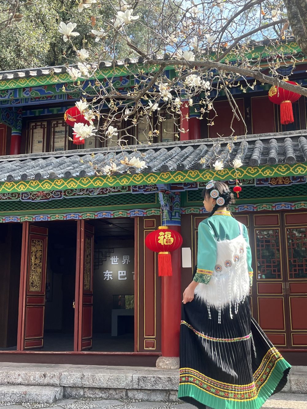 游客身著民族服飾在五鳳樓白玉蘭下打卡留影。(麗江融媒記者 段玉菊 攝)