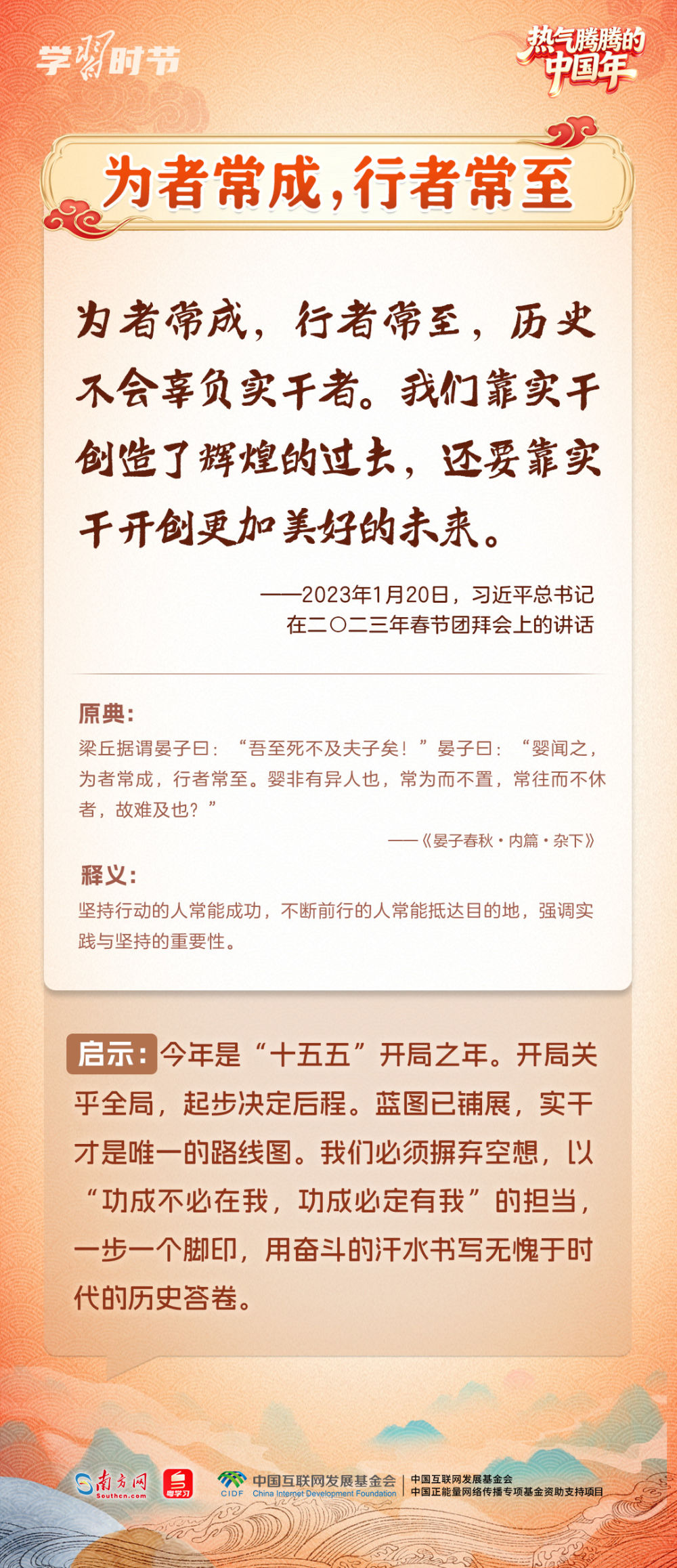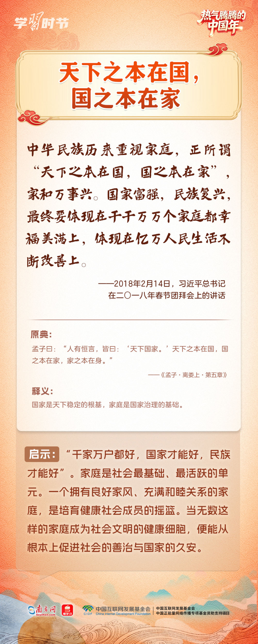“在中國式現(xiàn)代化新征程上策馬揚鞭、勇往直前,共同開創(chuàng)更加美好的未來?!?月14日,在二〇二六年春節(jié)團拜會上,習(xí)近平總書記的重要講話振奮人心。黨的十八大以來,習(xí)近平總書記多次在春節(jié)團拜會上發(fā)表重要講話,回望舊歲、展望新年,向大家致以美好的新春祝福。在講話中,習(xí)近平總書記常常巧妙引用古典名句砥礪人心,指引我們腳踏實地、銳意前行,提醒我們珍視親情、涵養(yǎng)孝道。一起來學(xué)習(xí)感悟。