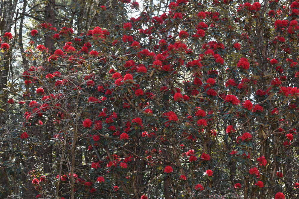 時(shí)下,在萬(wàn)畝杜鵑林里,漫山遍野的杜鵑花次第綻放,一簇簇、一片片杜鵑花沿著高山綿延十余里,與青山碧水交相輝映,美不勝收,將深山裝扮得春意盎然。杜鵑園是離主城區(qū)最近的純自然杜鵑花集中區(qū),當(dāng)?shù)厝朔Q萬(wàn)畝杜鵑園為“美旭閣”,漢語(yǔ)意為“紅杜鵑生長(zhǎng)最多的地方”。核心區(qū)海拔2600米,總面積4.5萬(wàn)畝,其中核心區(qū)面積近3000畝。
