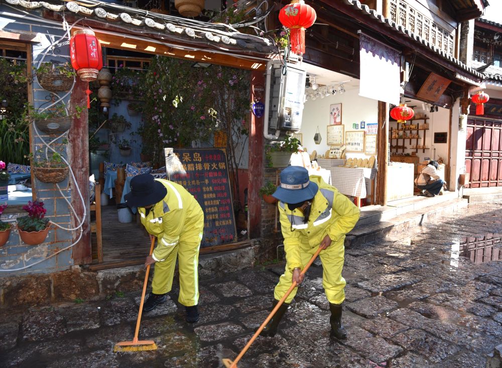 麗江古城的經(jīng)營戶也主動走出店鋪,清掃門前區(qū)域。(麗江融媒記者 段玉菊 攝)