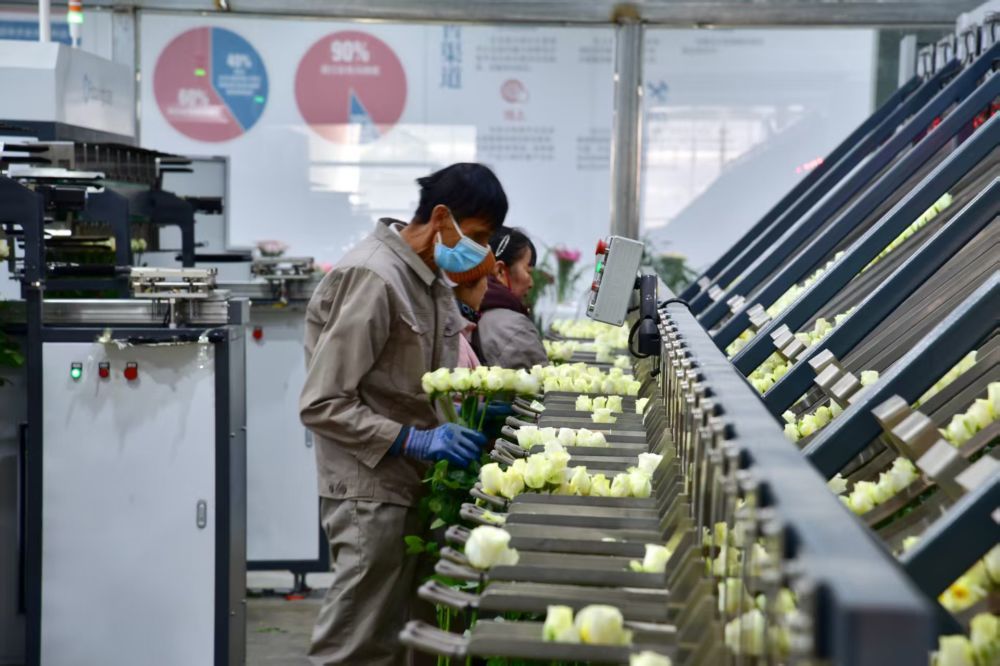 工人通過(guò)分揀機(jī)器分揀花卉。(麗江融媒記者 和麗勇 攝)