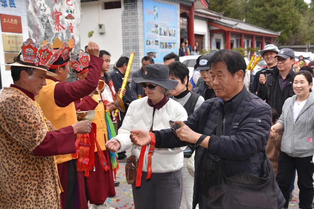 活動(dòng)現(xiàn)場(chǎng),身著納西傳統(tǒng)服飾的工作人員唱響悠揚(yáng)的納西民歌,以歌聲迎接遠(yuǎn)道而來的韓國客人。歌聲剛落,莊重的東巴文化儀式正式開始。伴隨著古樸的誦經(jīng)聲,東巴為游客祈福,并將象征平安吉祥的祈福帶系在每位游客手腕上,用納西族古老而誠摯的禮儀,送上對(duì)遠(yuǎn)方賓客的美好祝愿。