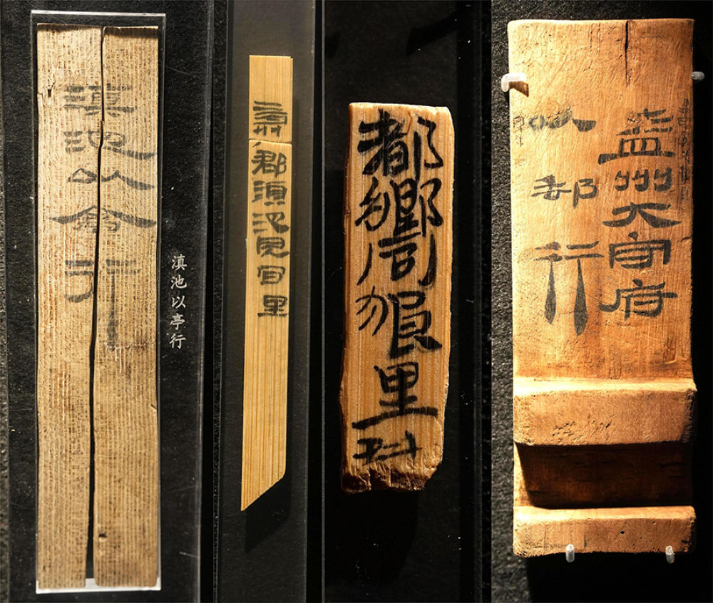 從左至右分別是:“滇池以亭行”簡牘、“益州郡滇池戹同里”簡牘、“都鄉(xiāng)同狼里”簡牘(仿制品)、“益州太守府以郵行”檢(仿制品)。拍攝于 “從西南夷到益州郡——戰(zhàn)國秦漢時期的云南”展