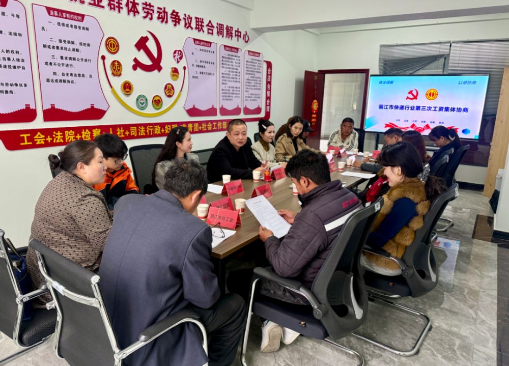 4月15日,麗江市快遞行業(yè)第三次工資集體協(xié)商在市新就業(yè)形態(tài)勞動爭議聯(lián)合調(diào)解室內(nèi)舉行。此次協(xié)商并非簡單的討價還價,而是麗江市總工會牢固樹立和踐行正確政績觀,將維護新就業(yè)形態(tài)勞動者權(quán)益放在心上、抓在手上的生動實踐。在這里,市委社會工作部、市總工會、市郵政管理局、市人力資源和社會保障局等職能部門的代表,與5家快遞企業(yè)負責(zé)人、律師、職工代表和婦聯(lián)、團支部代表共同商討快遞員的“錢袋子”和“命根子”——最低派費標準、驛站入庫費、快遞柜收費及女職工福利等核心條款。