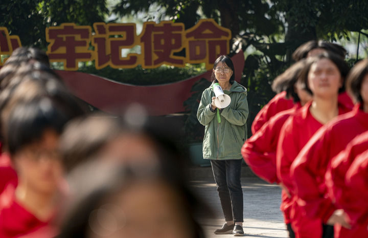 清晨,張桂梅在教學(xué)樓門前等候前來(lái)早讀的學(xué)生。(3月25日攝)