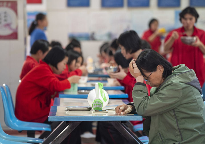 吃完藥,張桂梅又坐著電動(dòng)車趕到食堂,她要守著學(xué)生們吃飯。在她嚴(yán)格要求下,學(xué)生吃飯時(shí)間被限定在15分鐘以內(nèi),形成了良好的時(shí)間觀念。