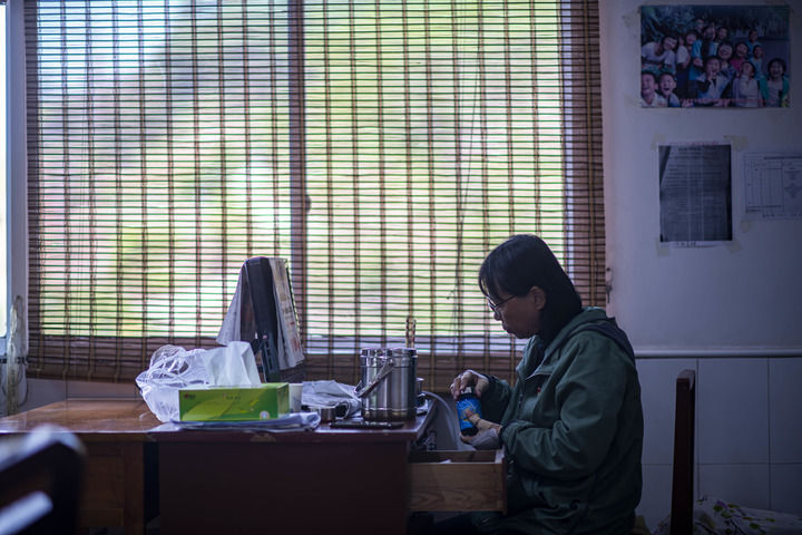午飯,張桂梅每天都是在辦公室里吃的。因有胃病,她一般只能喝點(diǎn)粥、吃一塊餅,然后把辦公桌抽屜里一個(gè)個(gè)瓶瓶罐罐翻出來(lái),把一大把藥片塞進(jìn)嘴里。
