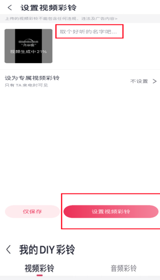 第二步:打開咪咕音樂APP—>我的—>我的彩鈴—>DIY彩鈴—>上傳自有視頻—>取名、設置視頻彩鈴—>過5~10分鐘審核通過就可以了。