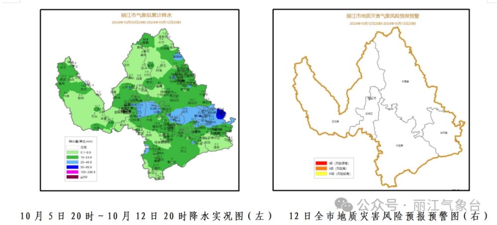上周(10月5日20時(shí)至12日20時(shí))全市167個氣象監(jiān)測站平均降水量為15.7毫米,最大降水量62.5毫米,出現(xiàn)在華坪縣船房鄉(xiāng)船房站(見下頁圖左);全市最高氣溫34.5℃,出現(xiàn)在永勝縣片角鎮(zhèn)牟尼山站;全市最低氣溫4.5℃,出現(xiàn)在玉龍縣大具鄉(xiāng)牦牛坪站。從10月12日全省地質(zhì)災(zāi)害風(fēng)險(xiǎn)預(yù)報(bào)預(yù)警圖上看,我市地質(zhì)災(zāi)害氣象風(fēng)險(xiǎn)等級較低(見下頁圖右)。