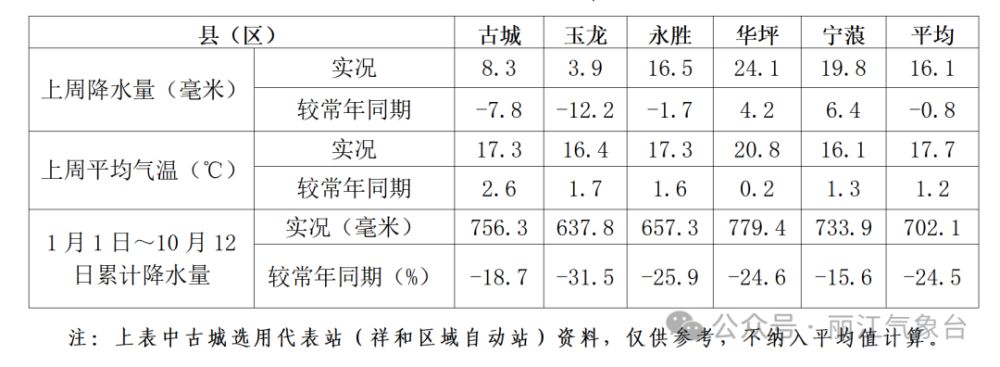 上周我市以陰雨天氣為主,其中,8至10日受切變系統(tǒng)影響,華坪縣、永勝縣出現(xiàn)局地性大雨。上周全市平均降水量為16.1毫米,較常年同期偏少0.8毫米;平均氣溫17.7℃,較常年同期偏高1.2℃;平均累計(jì)日照24小時(shí),較常年同期偏少14小時(shí)(詳見下表)。