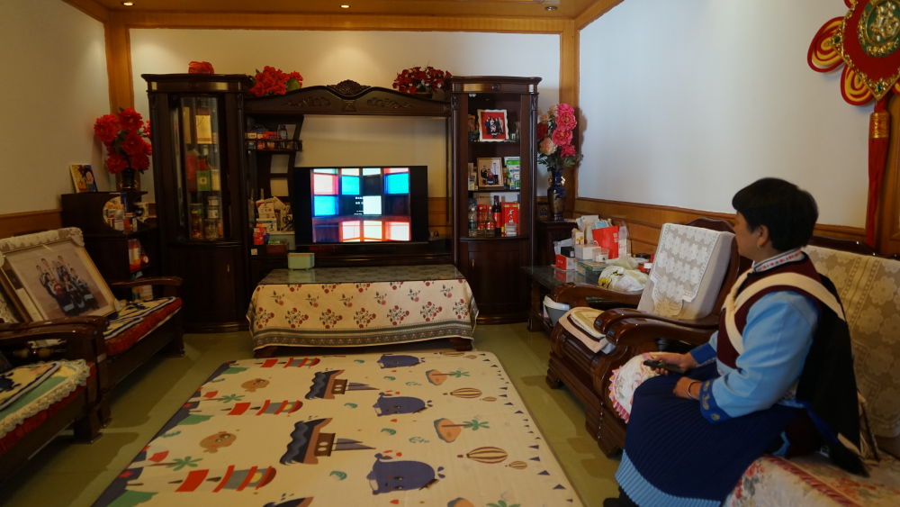 古城區(qū)祥和街道八河社區(qū)居民和清秀在看電視。(麗江融媒記者 李琳 攝)