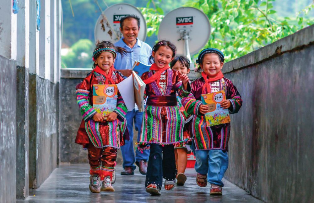 在貴州省黔東南苗族侗族自治州從江縣西山鎮(zhèn)的中寨教學(xué)點(diǎn),學(xué)生們?cè)谙抡n后走出教室(2024年9月6日攝)楊文斌攝 / 本刊