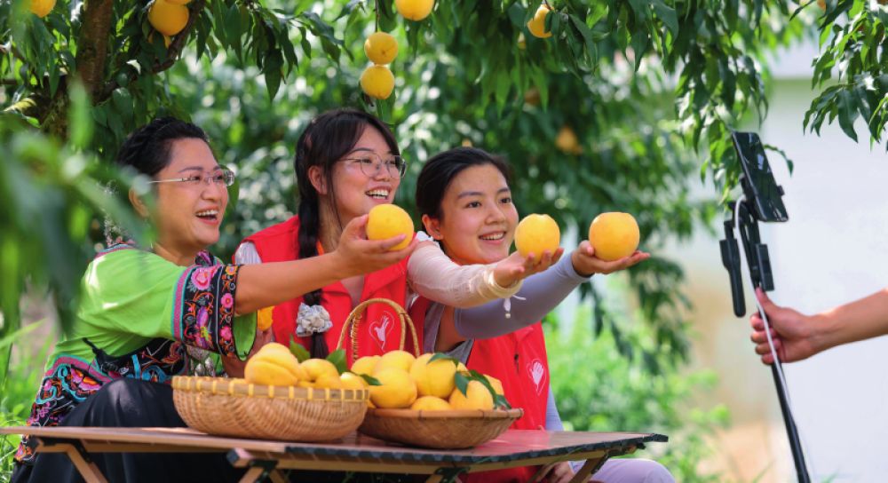 在貴州省銅仁市玉屏縣亞魚(yú)鄉(xiāng)郭家灣村黃桃種植基地,青年志愿者通過(guò)直播幫助果農(nóng)推銷黃桃(2025年8月9日攝)新華社發(fā)(胡攀學(xué)攝)