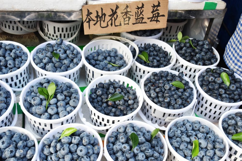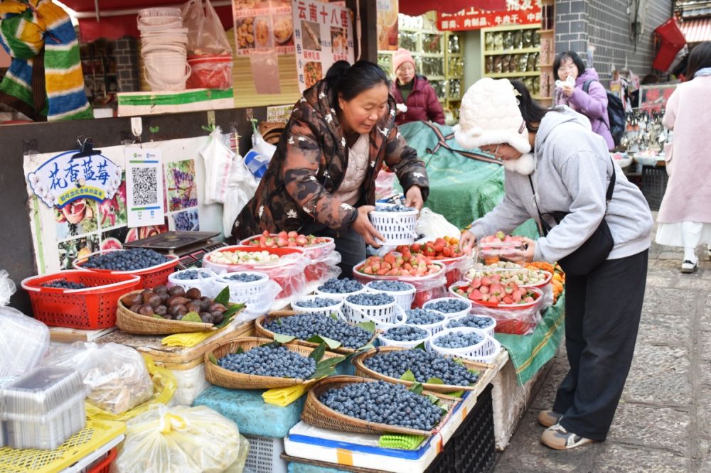 在麗江忠義市場,各水果攤位將飽滿鮮亮的藍(lán)莓?dāng)[在顯眼位置,藍(lán)紫色果實(shí)顆顆圓潤、果香濃郁,吸引不少市民、游客駐足挑選、現(xiàn)場品嘗。