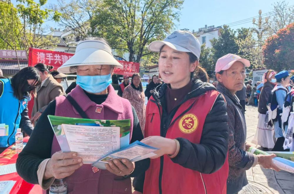 工作人員為過往市民發(fā)放宣傳冊。(麗江融媒記者 木雯嬌 攝)