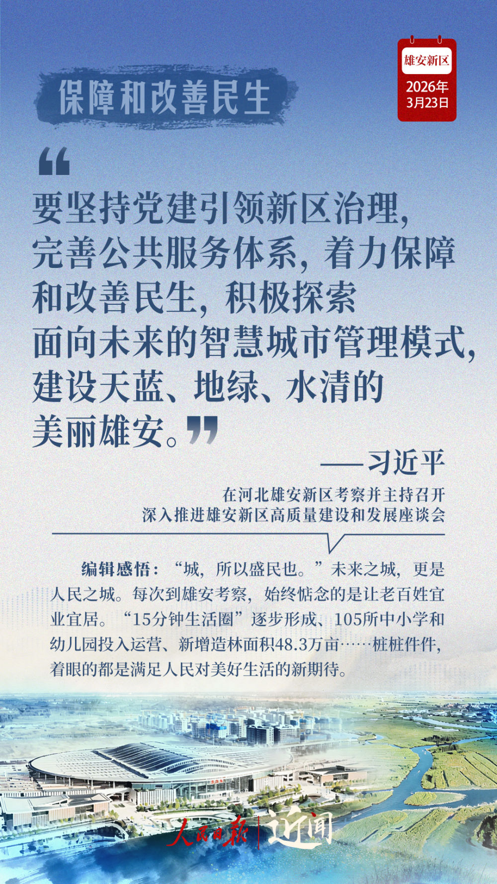 9年時(shí)間,從一塊地到一張圖,再到一座城,“黨中央始終給予最大的希望”;從第一次到雄安時(shí)在安新縣主持召開的一場(chǎng)小型座談會(huì),到高標(biāo)準(zhǔn)高質(zhì)量推進(jìn)雄安新區(qū)建設(shè)座談會(huì),再到深入推進(jìn)雄安新區(qū)高質(zhì)量建設(shè)和發(fā)展座談會(huì),一步一個(gè)腳印,刻印下現(xiàn)代化“未來之城”的拔節(jié)生長。