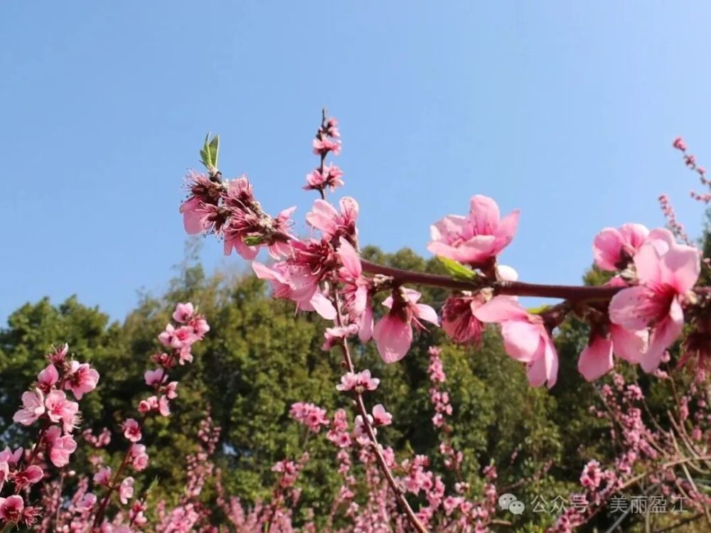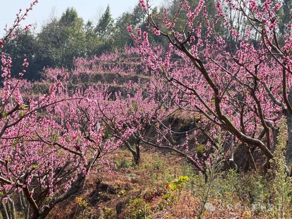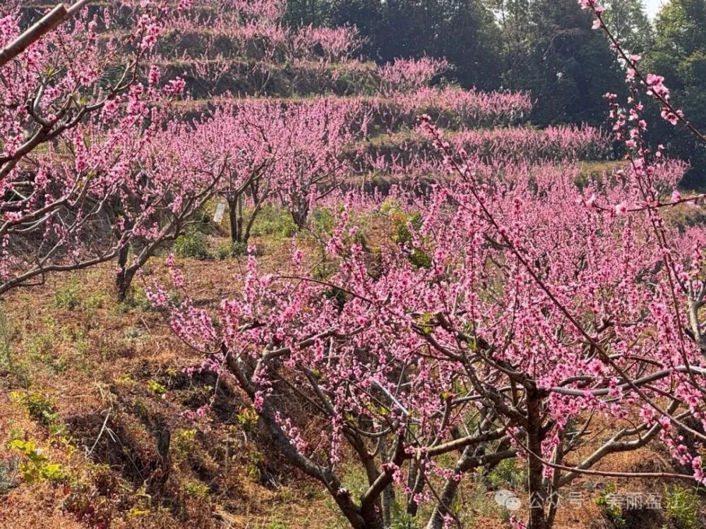 千萬朵桃花迎著晨光鋪展開來,如云霞輕覆山間。花瓣薄如蟬翼,風一吹便簌簌飄落,鋪成一條溫柔的花徑,香滿山谷。遠觀是漫山錦繡,近看是朵朵嫣然,將整個山嶺暈染成一幅清麗的春日畫卷。