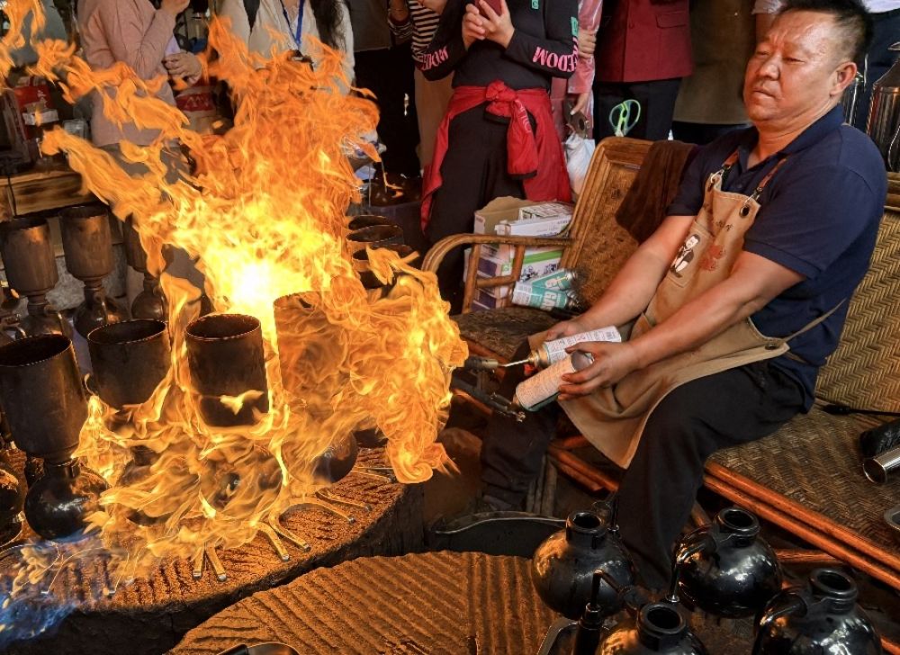 “咖叔”李金合正在制作火燒咖啡(3月25日攝)。