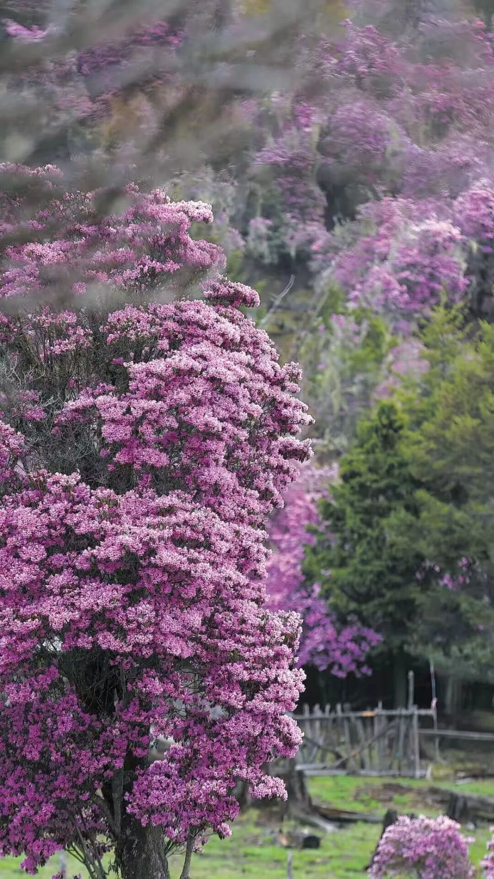 麗江的杜鵑,同樣壯觀。這里的杜鵑不是一株兩株,是一山一山地開。老君山的杜鵑林,樹齡上百年的比比皆是,花開的時(shí)候,整座山都變得姹紫嫣紅,顏色濃得化不開,像誰(shuí)用油畫刀厚厚地抹上去似的。站在山腳下往上看,只覺得那花海是流動(dòng)的,從山頂一路淌下來(lái),淌到腳邊。山風(fēng)過(guò)處,花枝搖曳,像千萬(wàn)只蝴蝶同時(shí)扇動(dòng)翅膀。