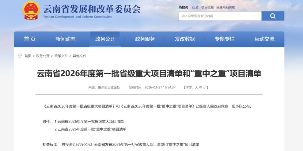 近日,云南省公布2026年第一批省級(jí)重大項(xiàng)目清單和“重中之重”項(xiàng)目清單?!皟蓮埱鍐巍惫布{入省級(jí)重大項(xiàng)目1677個(gè)、總投資2.57萬億元,其中年度計(jì)劃投資超10億元的“重中之重”項(xiàng)目52個(gè)、總投資8914億元。