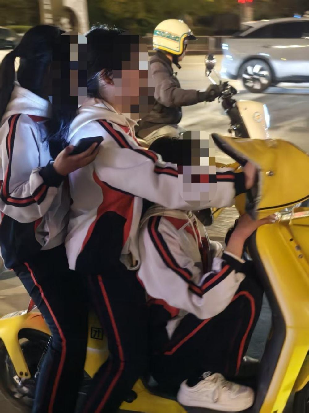 多名未成年人共騎一輛電動車。(麗江交警 供圖)