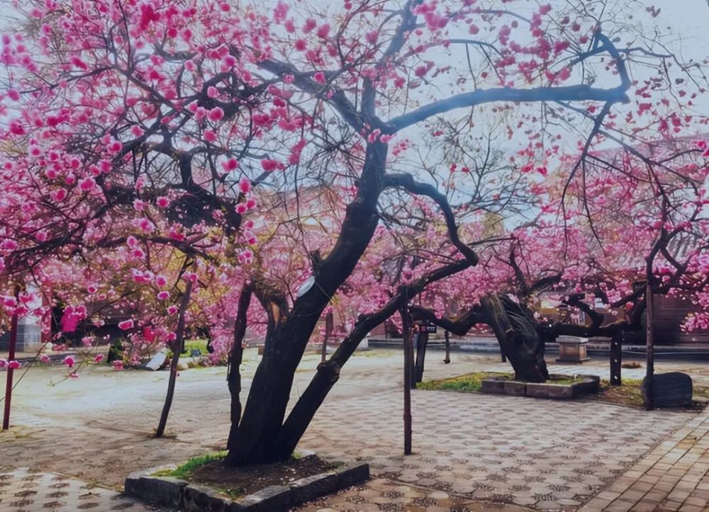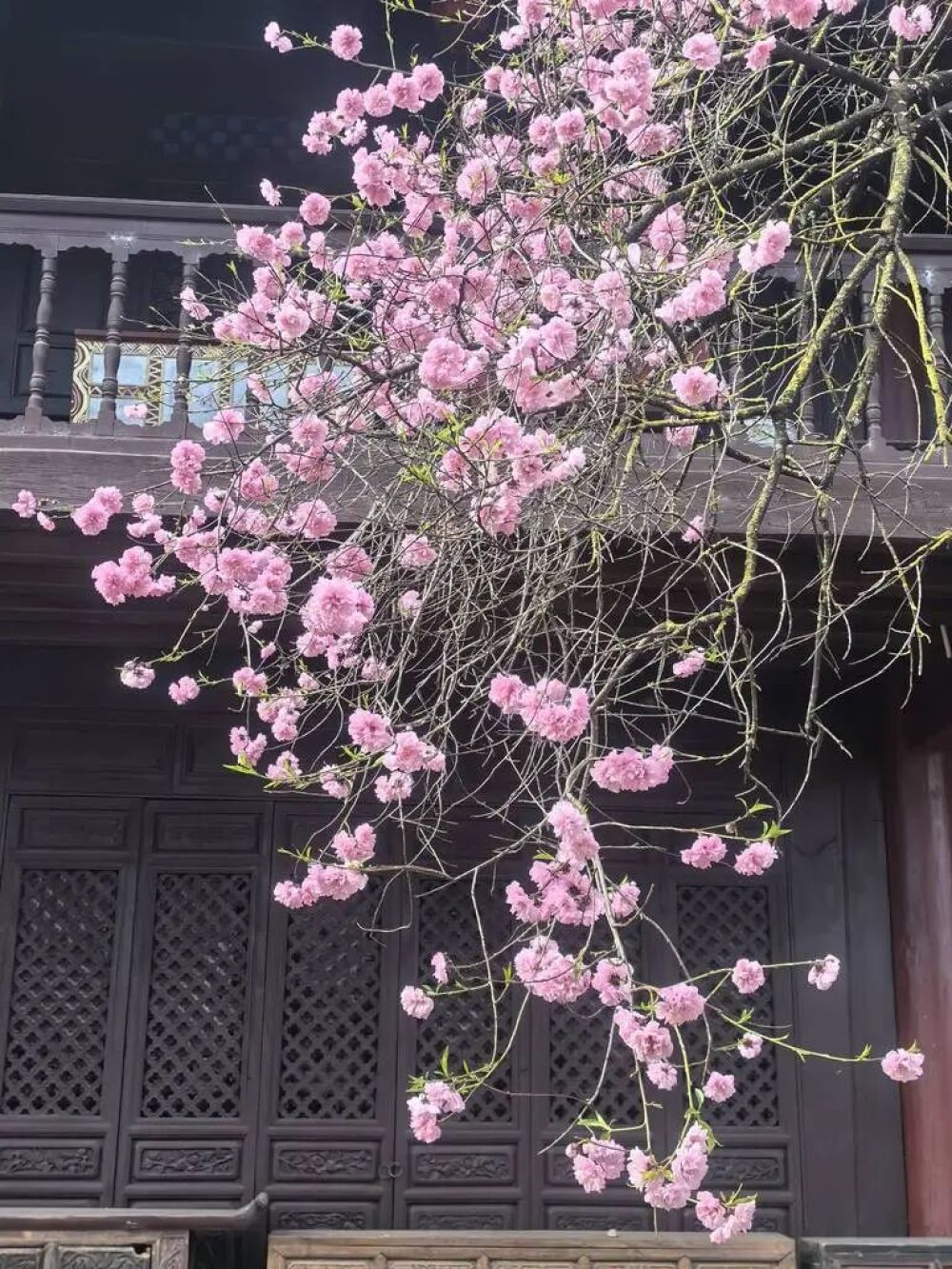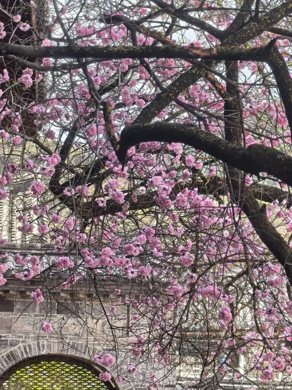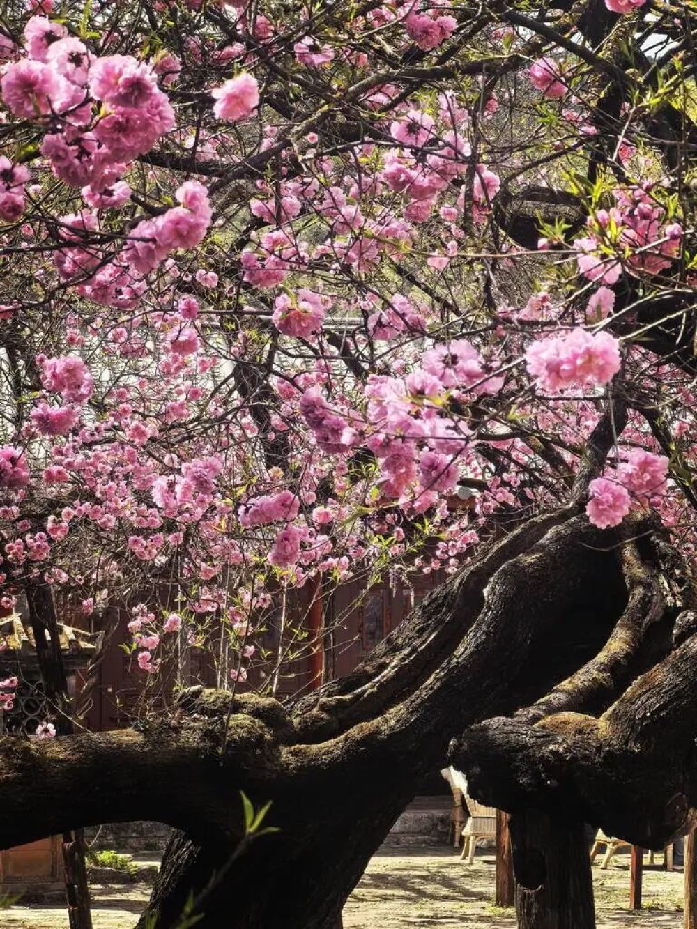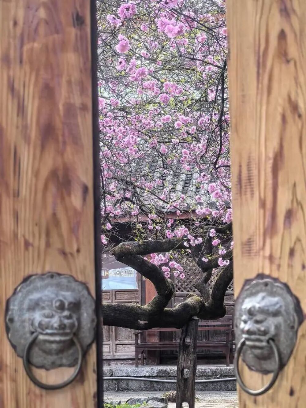 老枝虬曲如篆,皴裂的紋路恰似茶馬古道的掌紋,層層疊疊的繁花綴在其間,與木氏土司古建的雕梁畫棟相映成趣——朱紅的梁柱襯著粉白,黛色的飛檐銜著云霞,將千年茶馬的塵煙古韻,細(xì)細(xì)揉進(jìn)這抹繾綣春光里。這座藏于束河腹地的院落,本是明代木氏土司“束河院”的遺存,大覺宮的明代壁畫靜立檐下,朱砂凝雪域之魂,石青染江南之秀,漢、藏、納西等多民族的藝術(shù)神韻在色彩間流轉(zhuǎn),暈開歲月的溫潤。如今博物館啟門迎客,免費(fèi)講解的聲線與花香纏繞,百年碧桃便成了最詩意的“箋紙”,邀世人共赴千年之約。