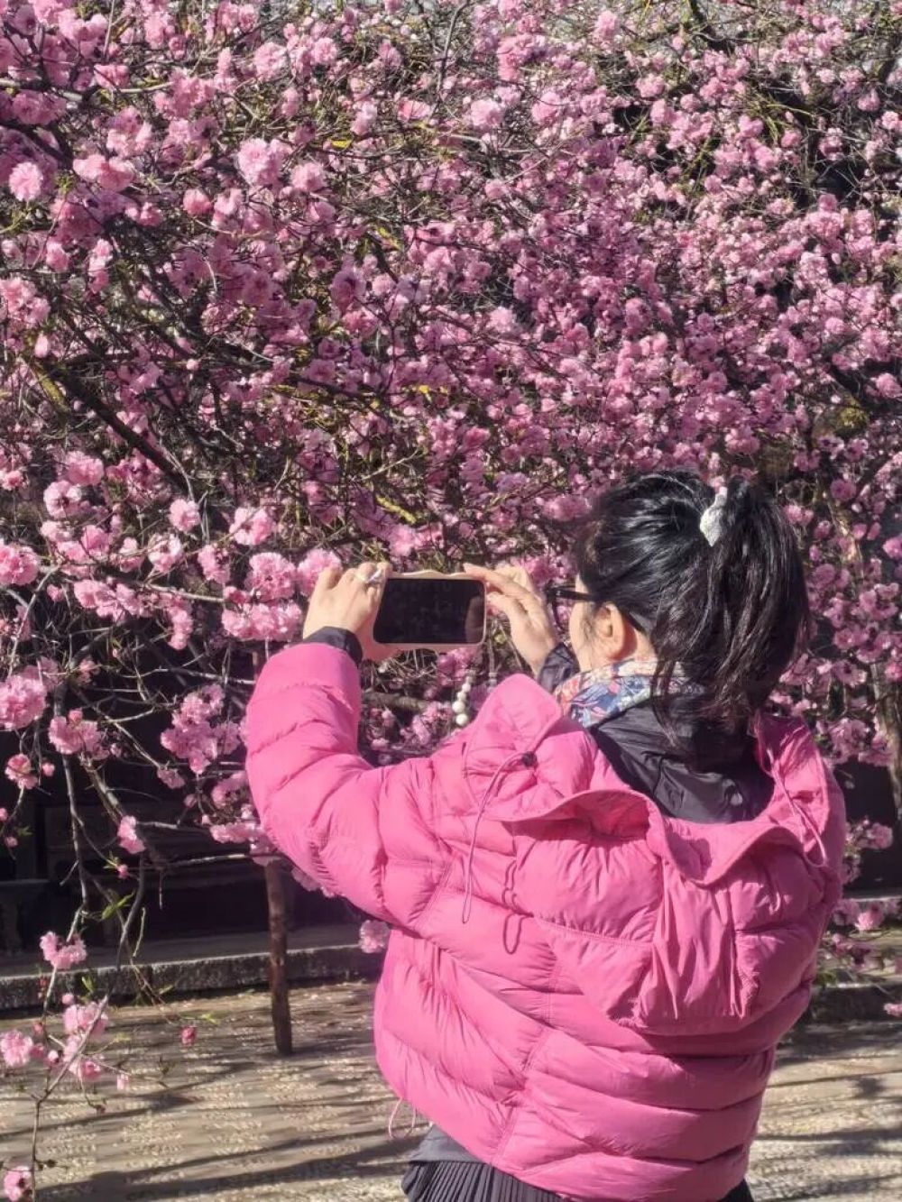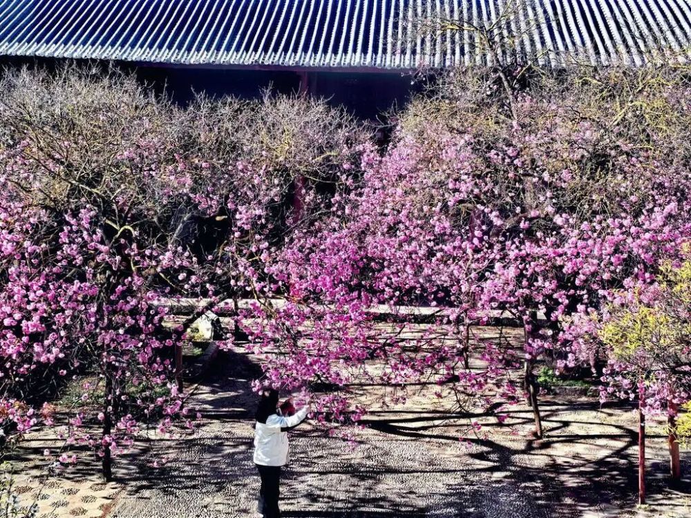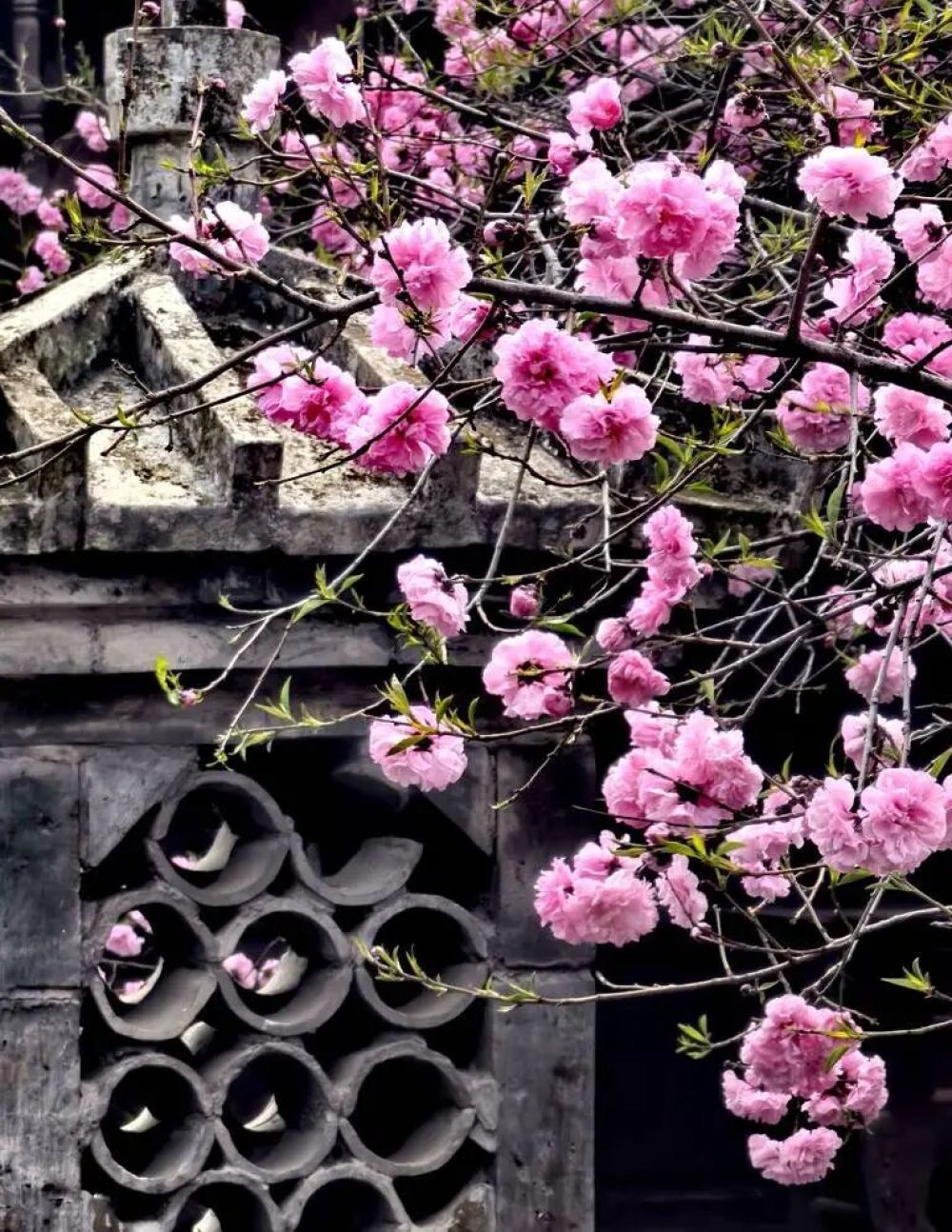 漫步院中,一步一景皆含詩韻:抬眼是粉云壓檐,花瓣簌簌落肩頭;低眉見青瓦承露,花影淺淺映石階;轉(zhuǎn)身遇壁畫流韻,朱砂石青訴千年;觸指是馬幫遺物的歲月肌理,粗糙處藏著古道的堅(jiān)韌。古建的厚重與繁花的柔美在此相融,歷史的滄桑與春日的鮮活在此相擁,每一縷花香都裹挾著千年的故事,每一陣春風(fēng)都傳頌著馬幫的傳奇。